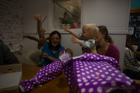 Paula got a ball to play with, a monkey dolly and a bird mobile. And Finja got a nice set of a cutting board and several wooden fruits while all fruits are separable in the middle by a velcro. Using a knife to seperate them in a pretty realistic manner means heap of fun! Thanks so much for this present Jochen and Miriam! She also got a dolly by Manu and Marie, one beeing called Wolly the Wombat which scared her in the beginning and now she loves it.