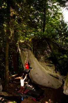 Der nächste Tag bot schon deutlich trockenere Bedingungen, wir nutzen die Gelegenheit, ein neues Gebiet hier auszukundschaften: Die North Wall Boulders. In einer kurzen morgensession gelang mir recht schnell „Immunized“, V9 (~fb 7c) und am Nachmittag konnte ich mit „Ressurection“ meine erste V9 flashen! Katinka begeisterte sich währenddessen für Space Monkey, V5 (~fb 7a) und versuchte sich an allerlei anderen Bouldern.