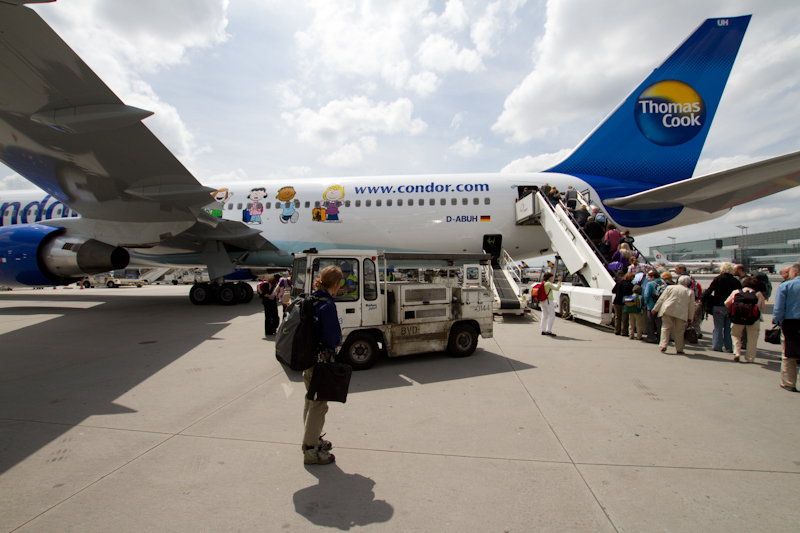 Um 14.50 Uhr hebt unser Flugzeug wie geplant ab, leider jedoch erleben wir eine böse Überraschung, denn das Condor-Flugzeug ist miniklein und ungemütlich. Wir haben soviel Platz wie in einem Kurzstreckenflugzeug, bekommen keinen Fensterplatz mehr und können nicht mal ansatzweise hinausschauen, da direkt neben uns das Klo die Sicht versperrt. Wir haben keinen eigenen Fernseher sondern nur einen Gemeinschaftsfernseher und Kopfhörer müssen gekauft werden. Aber nach knapp zehn Stunden ist der Flug vorbei und wir sind in Kanada.