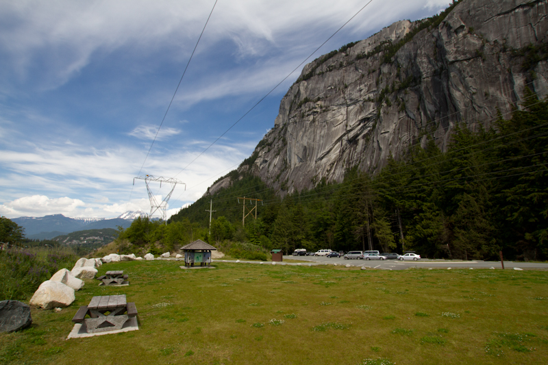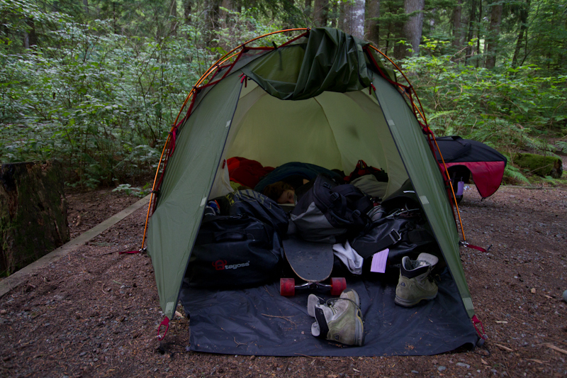 Die Busfahrt verläuft gemütlicher wie der Flug und nach weiteren 90 Minuten sind wir in Squamish, leider darf uns der Busfahrer jedoch nicht die 5km vor der Stadt direkt am Campground rauslassen, da er sonst seine Lizenz verlieren könnte, also heißt es Reisetaschen auf das Longboard schnallen und laufen, zumindest die letzten zwei Kilometer wurden wir dann noch von einem netten Kanadier mitgenommen.