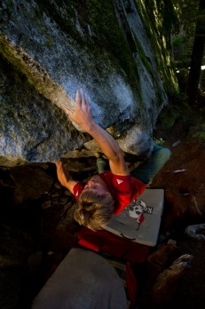 Am nächsten Tag wollen wir uns ein weiteres Bouldergebiet, etwas weiter im Norden, anschauen: Paradise Valley. Ein superschönes, ruhiges Tal mit einigen netten Blöcken. Die Classics sind schnell geklettert („The Fridge“, V7 , „Tai-Fighter“, V4 und der Highball „Enchanted“, ebenfalls V4), die Hitze ist hier leider etwas stärker zu spüren als am Chief in Squamish, da hier relativ wenig Wind weht. Abends treffen wir wieder auf Arthur, es gibt leckere Bratpfannenpizza und am nächsten morgen Blaubeerpfannkuchen. Nun werden wieder Classics geklettert bis die Finger schmerzen und wir uns auf leckeres Geschnetzeltes Fleisch freuen dürfen. Den Tag schon als beendet erklärt kommt nochmals Dave vorbei und zusammen geht es nochmal ans bockelharte „Tai-Fighter“, V4, das nun auch Katinka klettern kann, ein krönender Abschluss also für dieses kleine Gebiet. Nächster halt ist an den Powerline Bouldern, da diese aber in der knalligen Sonne liegen, schauen wir uns das Gebiet nur kurz an und bereiten dann unsere Fahrt nach Vancouver Island vor.