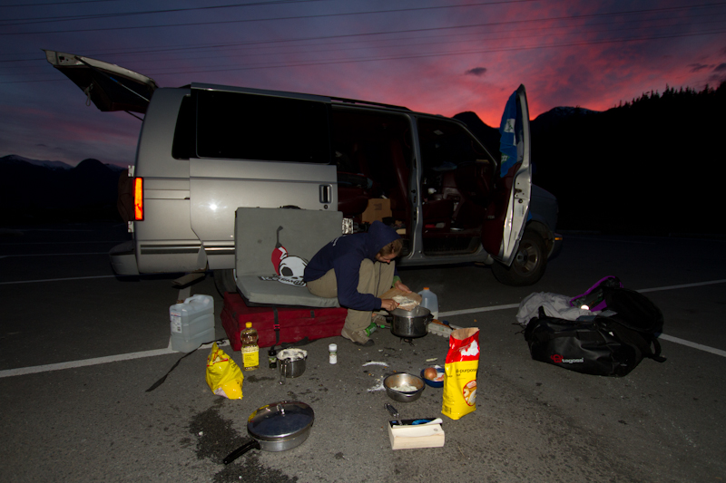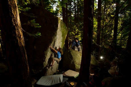 Am nächsten Morgen entscheiden wir uns Routenklettern zu gehen. 25km weiter im Norden ist der Cheakamus Canyon. Unser Auto ist super Geländegängig, wir schaffen es durch einen halben Meter tiefe Schlaglöcher bis zum Fels vorzufahren und müssen daher nicht allzuweit laufen. Recht slopriger, bachgestein Granit erwartet uns. Die Routen an der Forgotten Wall sind teilweise leider etwas größenabhängig, was Katinka in „The Incredible Journey“, 5.12a (UIAA 8+) feststellen muß. Die eigentliche Route taugt ihr recht gut nur die letzten zwei vier Meter, die eigentlich nicht mehr schwer sind muss sie durch einen knallharten Boulder ersetzen, da sie einfach nicht wie ich an den nächsten Griff reichen kann. Ich selber klettere noch „Sudden Impact“, 5.12c (UIAA 9-) im zweiten Versuch, onsighten ist hier ziemlich hart, da die Routen recht tricky sind und die Griffe immer etwas versteckt sind.