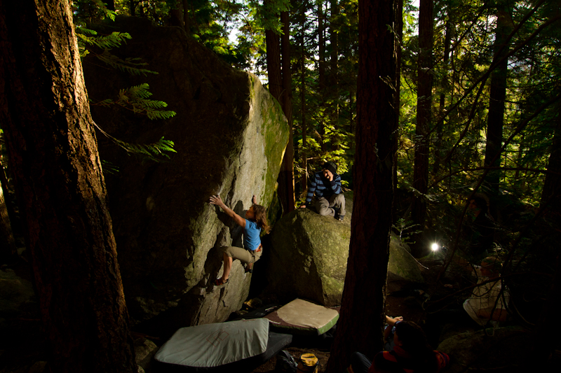 Ersteinmal: Direkt am Abend nach dem letzten Bericht konnte Katinka „Swank Stretch“, V5 (~fb 7a) klettern, im letzten Bericht war bereits ein Foto von ihr darin online zu sehen.Die Nacht darauf hat es direkt einmal angefangen zu Regnen, leider recht typisch für die Nahe am Pazifik gelegene Gegend. Wir beschließen also Ruhetag zu machen, da wir eh total zerstört sind. Im Laufe des Tages richten wir unser Auto so ein, das wir gemütlich drinnen Schlafen können und unser Zelt nun nicht mehr benötigen. Dazu lassen wir aus unserem Winterreifensatz die Luft ab, um sie flach in den Kofferraum legen zu können. Der ist zwar recht groß, aber die Reifen sind eben rießig und immerhin haben wir stolze acht Sitze in unserem Van. Am nächsten Tag wird wieder gebouldert, Der Australier Jay führt uns den ganzen Tag durchs Gebiet von einem klassiker zum nächsten und ich knüppel alles nieder was sich mir in den Weg stellt. Am Schluss des Tages hab ich Boulder bis V8 (~ fb 7b: „El Camino“) im Routenbuch stehen, darunter Flashbegehungen bis V7 (~ fb 7b: „Master Plan“). Katinka scheitert ganz knapp an einer Flashbegehung von „Trad Killer“, V4 (~ fb 6c) und holt ihn sich dann direkt im zweiten Versuch.