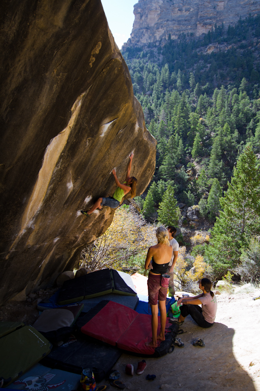 Zwei Tage lang schauen wir uns das Bouldergebiet Little Cottonwood Canyon, das etwa zwanzig Fahrtminuten von Arthurs Haus entfernt liegt, an. Dank leichtem Nieselregen und der Tatsache, dass es hier bereits die letzten vier Tage geregnet hat, ist alles etwas feucht, aber dennoch freuen wir uns, mal wieder etwas anderes zu sehen und nicht mehr stundenlang zum Fels laufen zu müssen.