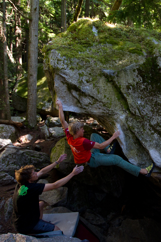 Nachdem ich vor einigen Wochen den Stehstart „Worm World Cave“, V9 (fb 7c) zügig klettern konnte und zwanzig Minuten später aus dem Sitzstart kommend am letzten, an sich nicht allzuschweren Zug abgeflogen bin, ist es hier immer wärmer und schwüler geworden, so dass ich mittlerweile gut sieben Tage in den Durchstieg stecken musste. Schließlich hatten wir uns dann endlich vorgenommen, dass wir genug von Squamish haben, morgen geht es weiter, letzter Tag. Ich will mich noch ein letztes mal in Worm World Cave probieren, klettere zum aufwärmen zweimal den Stehstart, und schaffe es dann direkt im ersten Versuch die knapp zehn Züge aneinanderzureihen. Jippie! Gute Laute, psyched! Direkt danach weiter zum nächsten Boulder, den bisher sehr schwer erscheinenden Boulder „The Stinger Low“, ebenfalls V10, drücke ich direkt auch noch im zweiten Versuch ab. Sending Day! Ein super letzter Tag :).