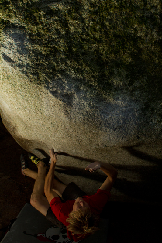 The Egg ist ein markantes Sloper-Heelhook-Gepatsche das durchaus an ein Ei erinnert. Die Schwierigkeit konzentriert sich vorallem auf den ersten Zug von einem sloprigen Henkelband zu einem Sloper, während man den rechten Fuß und den linken Hook beinahe auf Handhöhe hat. In den ersten Zug musste ich einiges an Zeit stecken, mal bin ich zu weit links, mal zu weit rechts, meistens zu tief, manchmal zu hoch. Zwischendurch dann immer wieder die Situation, dass der Hintern es garnicht erst schafft vom Boden abzuheben. Aber schließlich geht mein Plan doch auf: Ich erwische den Griff perfekt und halte ihn endlich mal fest, lasse nicht mehr los, kämpfe mich die restliche V9 hoch und stehe endlich glücklich auf dem Block, während es um mich herum immer dunkler wird. Gerade noch geschafft, jetzt ist das Licht weg.