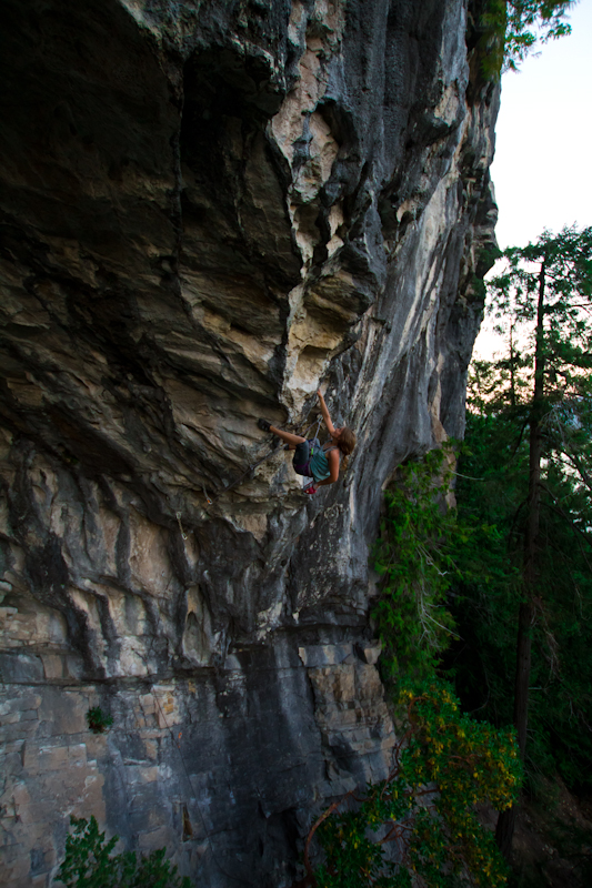 Die Tage hier verbringen wir meist bis um 4 Uhr Nachmittags mit baden und gammeln verbringen, da es erst ab spätem Nachmittag akzeptable Klettertemperaturen hat. 15 Minuten steil Bergauf in der Nachmittagssonne, jedesmal aufs neue ein Gewaltmarsch nach dem halbtägigem Sonnebrutzeln! Doch oben wartet außer bombastischer Aussicht auch schon unser Sofa (Crashpad) sowie eine bequeme Hängematte auf uns. Nach den noch recht schwitzigen Aufwärmrouten kühlt es dann in der Regel etwas ab und wir können uns dem wahren klettern widmen:Katinka begeistert sich für Subdivisions, 5.12d, die ihr an unserem letzen Tag in Horne Lake gelingt erste 7c (UIAA 9) Route ist. Ich klettere die Route ebenfalls und habe dafür in meinem Projekt „Moment of Silence“, 5.13d (8b bzw. UIAA 10) keinen Erfolg. Immerhin klettere ich einen Großteil der Crux bevor ich schließlich doch noch mit schweißnassen Händen abtriefe.