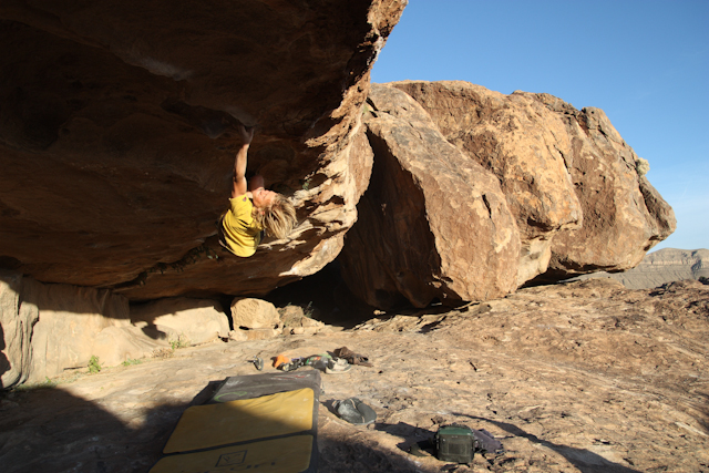 Mittlerweile konnten wir uns von dem Schock allerdings auch schon wieder erholen und selbst wieder etwas Fuß fassen. Tom hat hier massenhaft V7 (~fb 7b) Boulder abgezockt, Peter ist erfolgreich im amerikanischen Double-Digit-Grad (V10 ~ fb 7c+) unterwegs mit Bouldern wie „Free Willy“, „Wellsite-Dyno“, „Black Mamba“, etc. und Chris ist mit „Choirboys“ eine geniale V7 gelungen und ist seitdem wieder am driften (=sich treiben lassen) und genießt das hießige Environment.