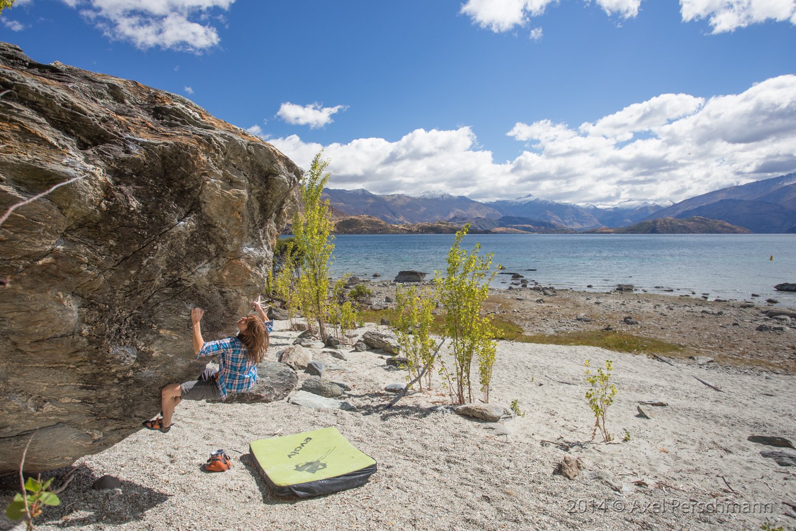 On our way to the westcoast we stopped for a day in Wanaka. It’s a small, but beautiful city just next to a beautiful lake. As you would guess we did not stop for no reason. We knew there are some rocks around the city to climb and thats what we did! We enjoyed some Lakeside Bouldering with boulders up to V7 and after a 20km drive along the lake we arrived at the „Main Cliff“. The rock was ok, but it did not impress us enough to grab the rope and the quickdraws to do some ropeclimbing. It’s always a struggle to go ropeclimbing just by yourselfe, carring one baby and no babysitter around.