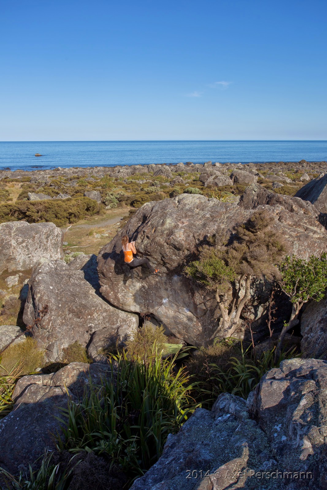 The next day we drove one hour to Turakirae Head, to check out the best local climbing spot. From the carpark it’s still an 5km hike, but its flat and you walk along the sea. It’s a lovely area but for hard climbing it was just way to warm. All Wellington people kept telling us how rough it can get here, we should always prepare and have a second layer of cloths with us at anytime, since the weather can change all over a sudden. But it never did. We had blue sky, with little to no wind and for the three days we spent in and around Wellington.